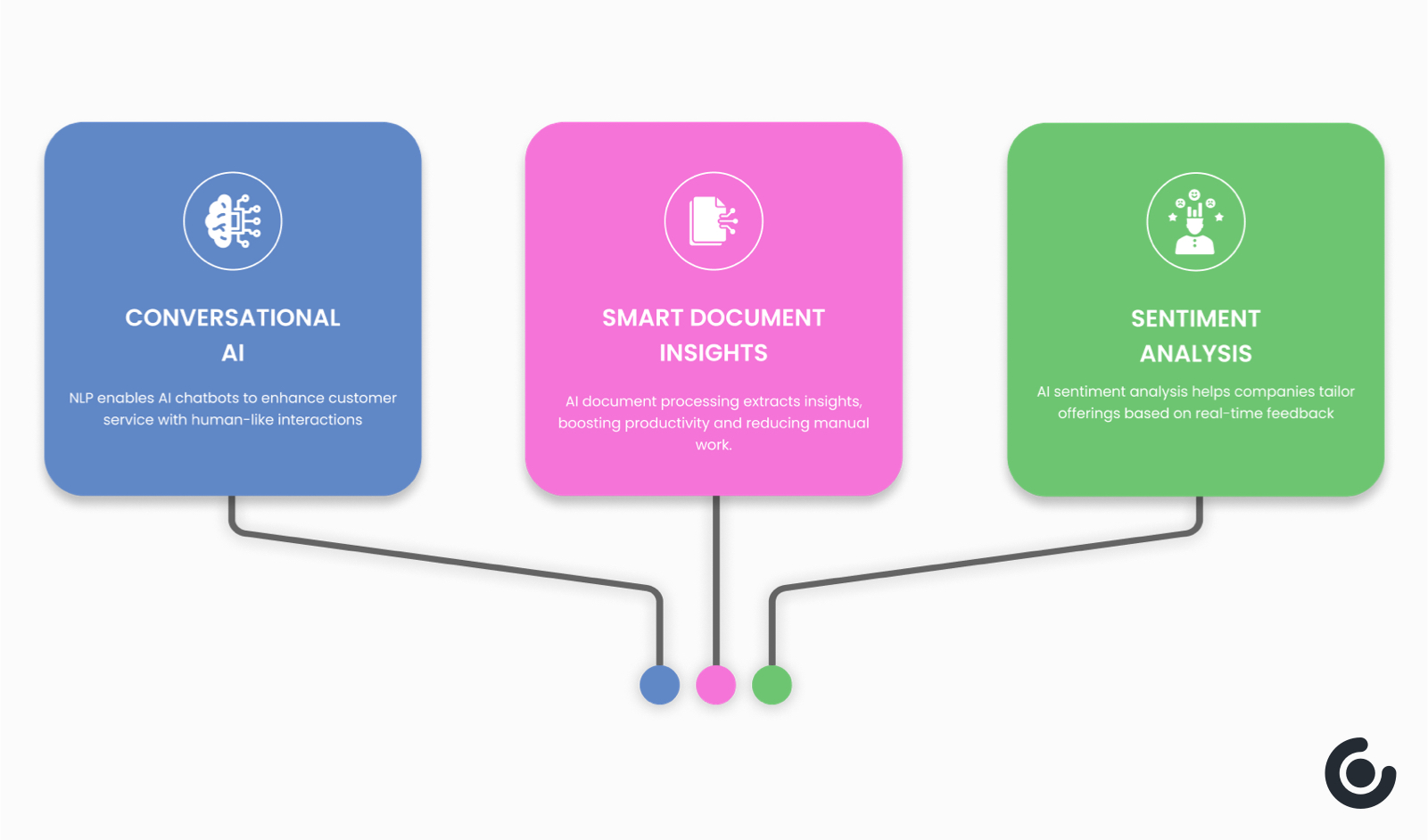 Expanded Example: Financial institutions use NLP in chatbots to assist with inquiries and automate loan processing. NLP also plays a critical role in extracting essential information from contracts, ensuring compliance, reducing human oversight, and improving response times in customer-facing roles.